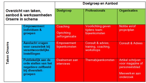 Het aanbod van Orserre is gekoppeld aan de taken en de daaruit voortvloeiende werkzaamheden die Orserre zich in het kader van haar missie, visie en waarden heeft gesteld.